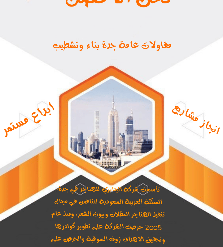 نقدم خدمات بناء وتشطيب متكاملة بخبرة طويلة وجودة عالية في جدة والمناطق المجاورة، حيث نعتني بأدق التفاصيل ونتأكد من تلبية جميع احتياجات عملائنا. نحن نستخدم أحدث التقنيات والمواد لتحقيق أفضل النتائج، ومن خلال فرقنا المتخصصة ونظامنا الإداري الفعال، نعمل على التأكد من أن كل مشروع ينفذ بأعلى المعايير السياقية. تفخر شركتنا بتاريخها الطويل في هذا المجال ونسعى دائماً لتعزيز علاقتنا مع العملاء من خلال تقديم حلول مبتكرة تلبي توقعاتهم وتجاوزها.